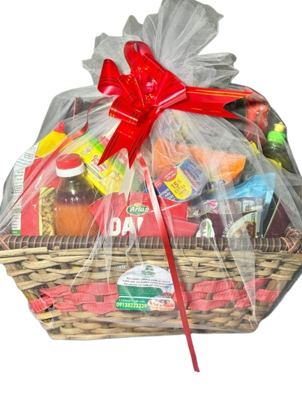 1kg of Basmati rice, 1kg semolina, 1 liter of palm oil, 1.6liter vegetable oil, Seasonings( cubes and salt), Sachets tomatoes (10 each), pepper (10), Tomatoes (10), Cornflakes, Ovaltine pouch (refill), Milk pouch (refill), 4 spaghetti, Non-alcoholic wine in wine bag, 1 kitchen towel, A roll of custard, A roll of pap, Cubed sugar , Dish wash, Lipton, Macaroni, Box tissue, 2Sardine, Bin bag, Weaved basket/ net/ ribbon/ card