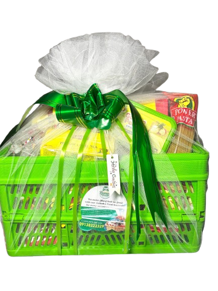1kg rice, 1kg semolina, 1 liter vegetable oil, Seasonings( cubes and salt), Sachets tomatoes (10) each peppe (10), Tomatoes (10), Tea pack, 2 spaghetti, 1 kitchen towel, A roll of custard, A roll of pap, Cubed sugar , Dish wash, Lipton, Macaroni, Box tissue, Sardine, Foldable basket/ net/ ribbon/ card