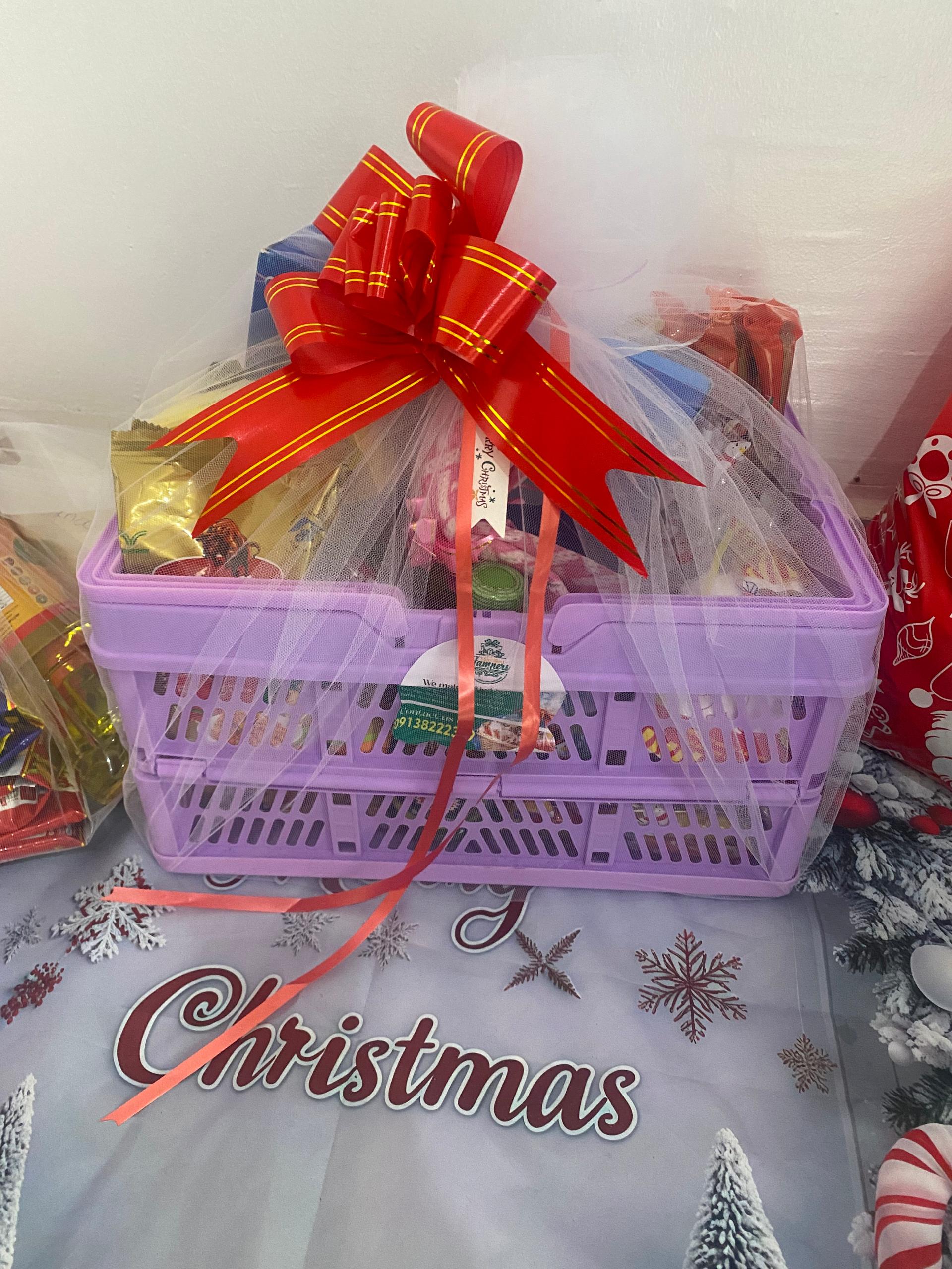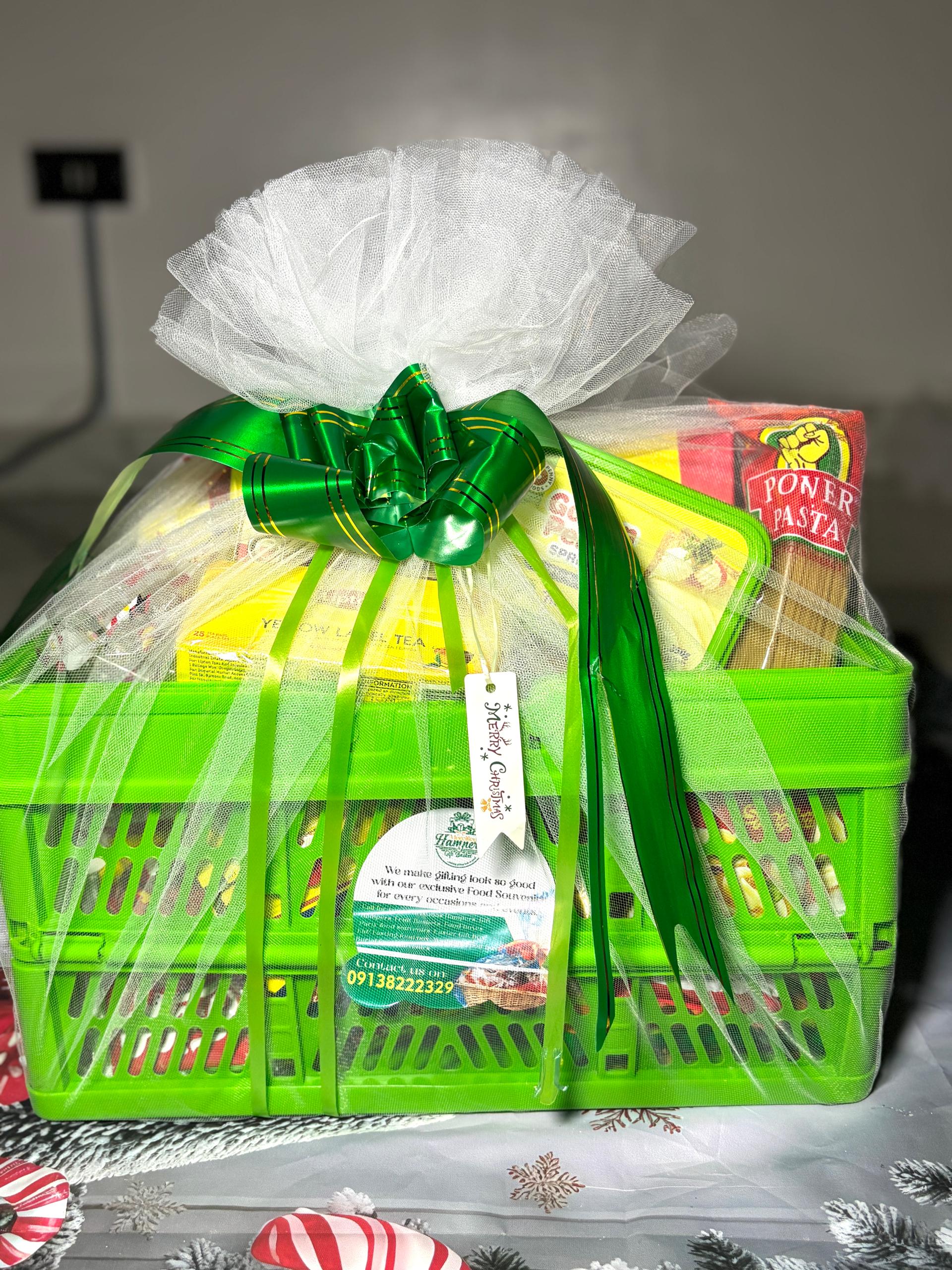 1kg rice, 1kg semolina, 1 liter vegetable oil, Seasonings( cubes and salt), Sachets tomatoes (10) each peppe (10), Tomatoes (10), Tea pack, 2 spaghetti, 1 kitchen towel, A roll of custard, A roll of pap, Cubed sugar , Dish wash, Lipton, Macaroni, Box tissue, Sardine, Foldable basket/ net/ ribbon/ card