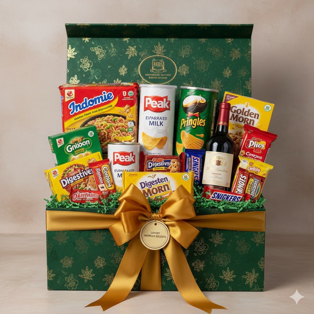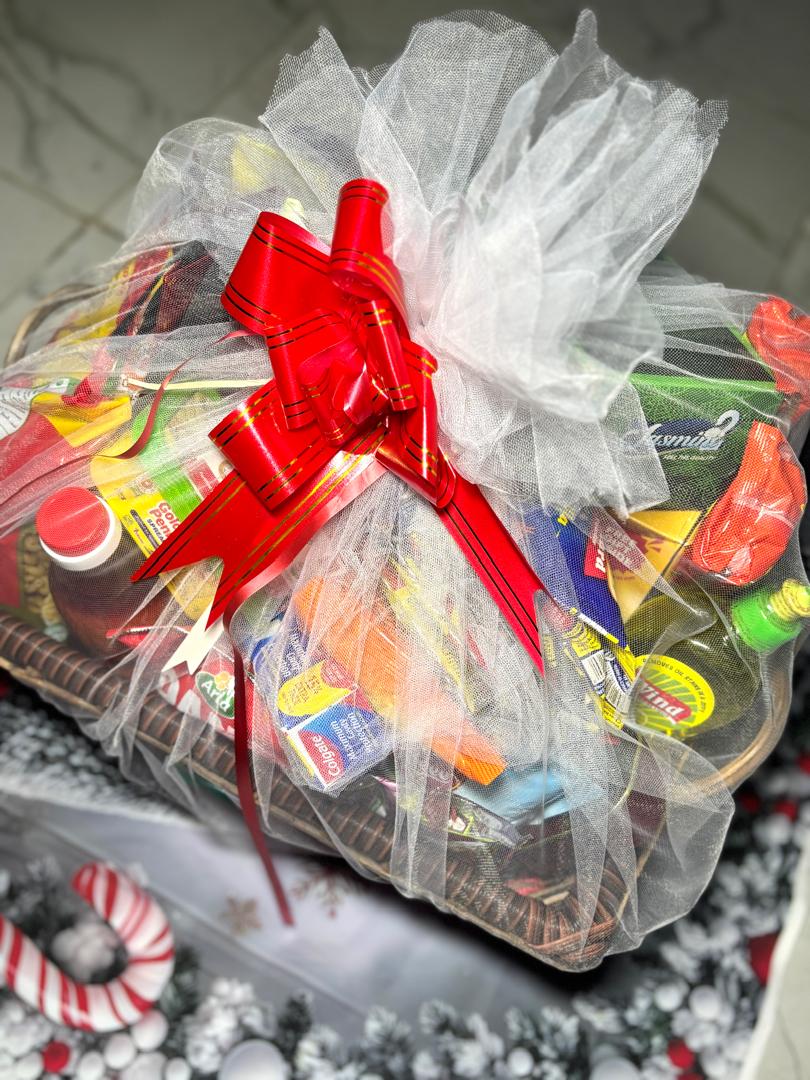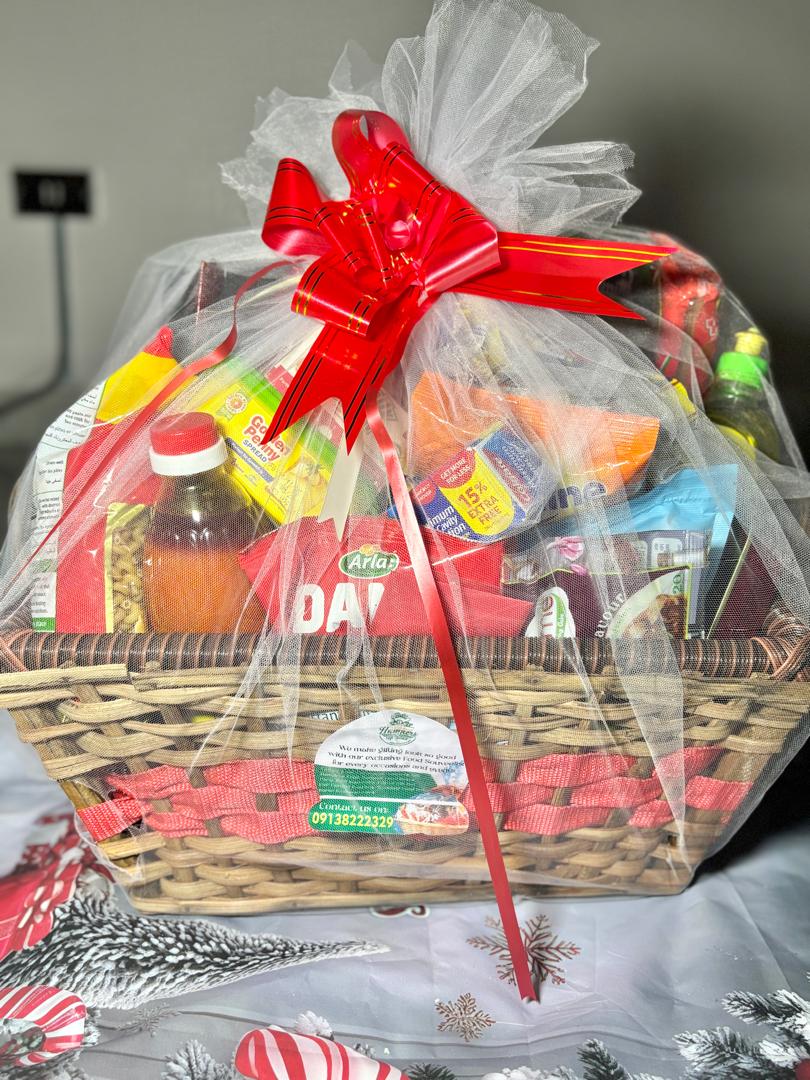 1kg of Basmati rice, 1kg semolina, 1 liter of palm oil, 1.6liter vegetable oil, Seasonings( cubes and salt), Sachets tomatoes (10 each), pepper (10), Tomatoes (10), Cornflakes, Ovaltine pouch (refill), Milk pouch (refill), 4 spaghetti, Non-alcoholic wine in wine bag, 1 kitchen towel, A roll of custard, A roll of pap, Cubed sugar , Dish wash, Lipton, Macaroni, Box tissue, 2Sardine, Bin bag, Weaved basket/ net/ ribbon/ card